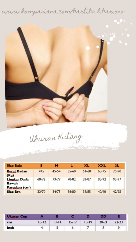 83-87 cm ukuran bra. Ukuran cup pada bra bisa diketahui dengan cara mengukur lingkar tubuh tepat di bagian payudara. Lingkar bawah payudara.