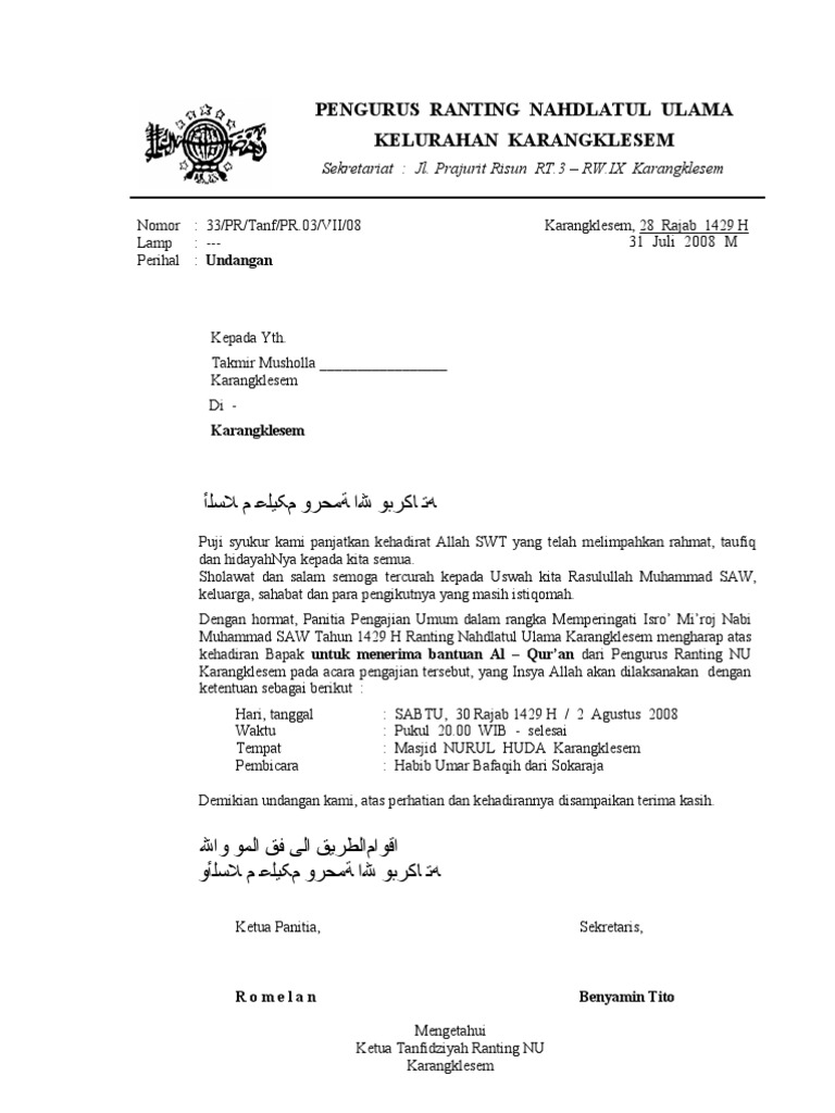 Kamis 29 Juli 2010 Jam 1930 WIB Masjid Al-Hasan Kebaon Banjarnegara Rapat persiapan menyambut bulan puasa 1431 H Demikian undangan ini kami sampaikan atas perhatian dan kehadirannya kami ucapkan terima kasih. Contoh Surat Undangan Rapat Takmir Masjid Dunia bisnis pendidikan contoh surat inspirasi hidup dan pengembangan diri. Mengharap kehadiran BapakIbuSdr dalam acara Rapat Pengukuhan Pengurus Takmir Masjid Al-Ghifary yang insyaAllah akan dilaksanakan.